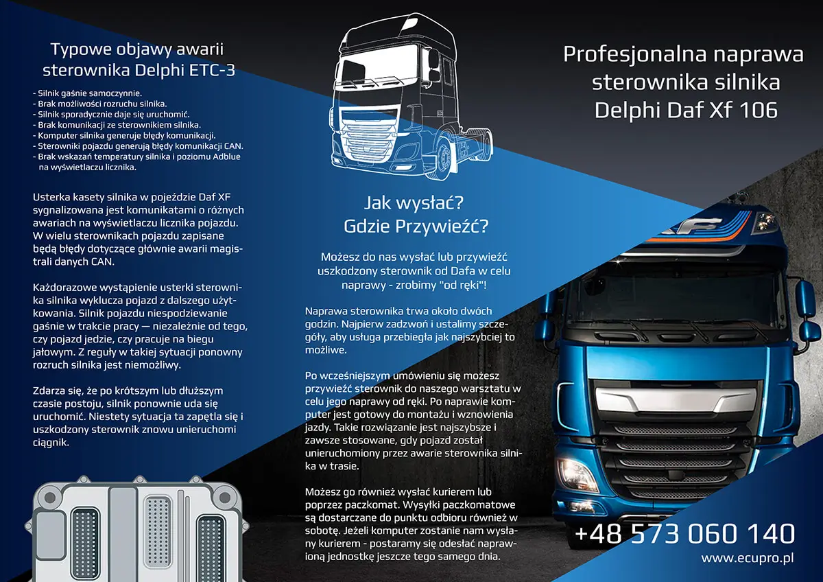 Произведенный компанией Delphi, компьютер двигателя устанавливается на такой грузовой автомобиль, как Daf Xf 106. Электронный блок управления регулирует работу дизельного двигателя, который питает этот популярный седельный тягач.